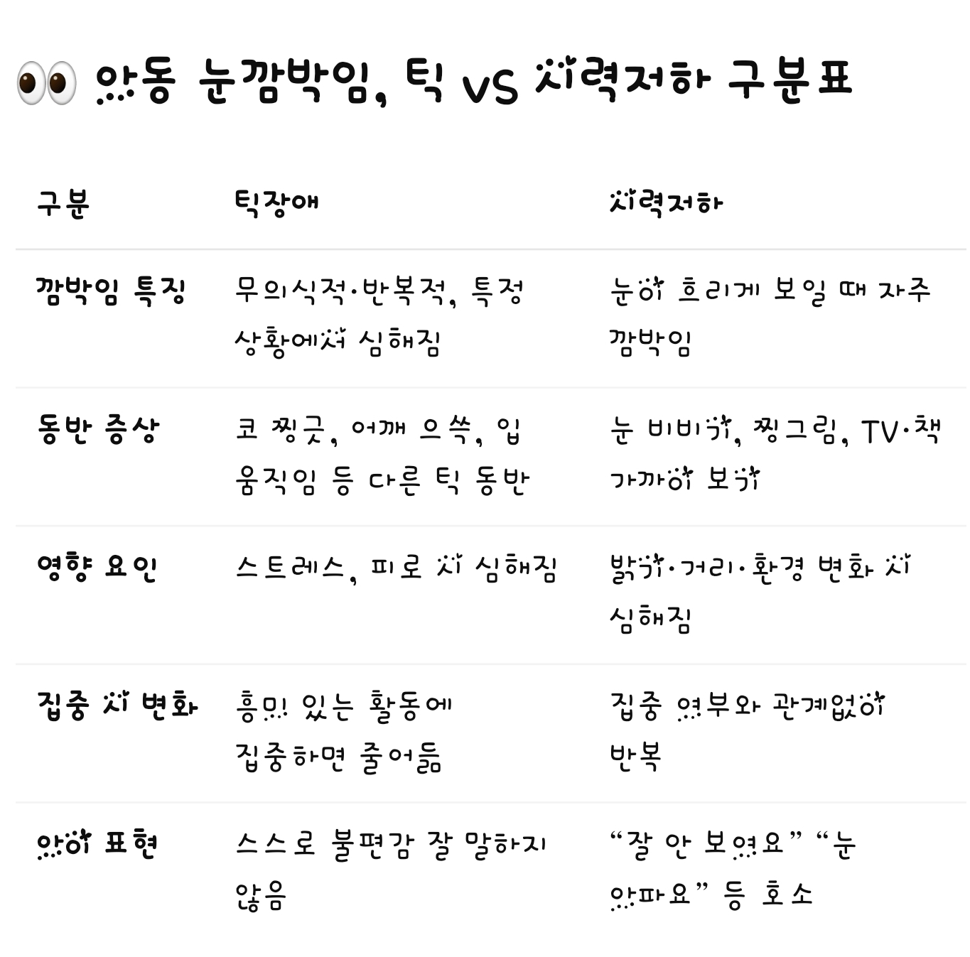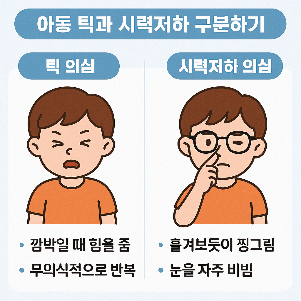 아이들이 눈을 자주 깜박이는 모습을 보면 부모로서는 걱정이 앞섭니다. “혹시 틱장애가 아닐까?” “시력이 나빠진 건 아닐까?” 고민이 될 수 있죠. 오늘은 아동 눈깜박임의 원인과 틱 vs 시력저하 구분법을 알려드립니다.