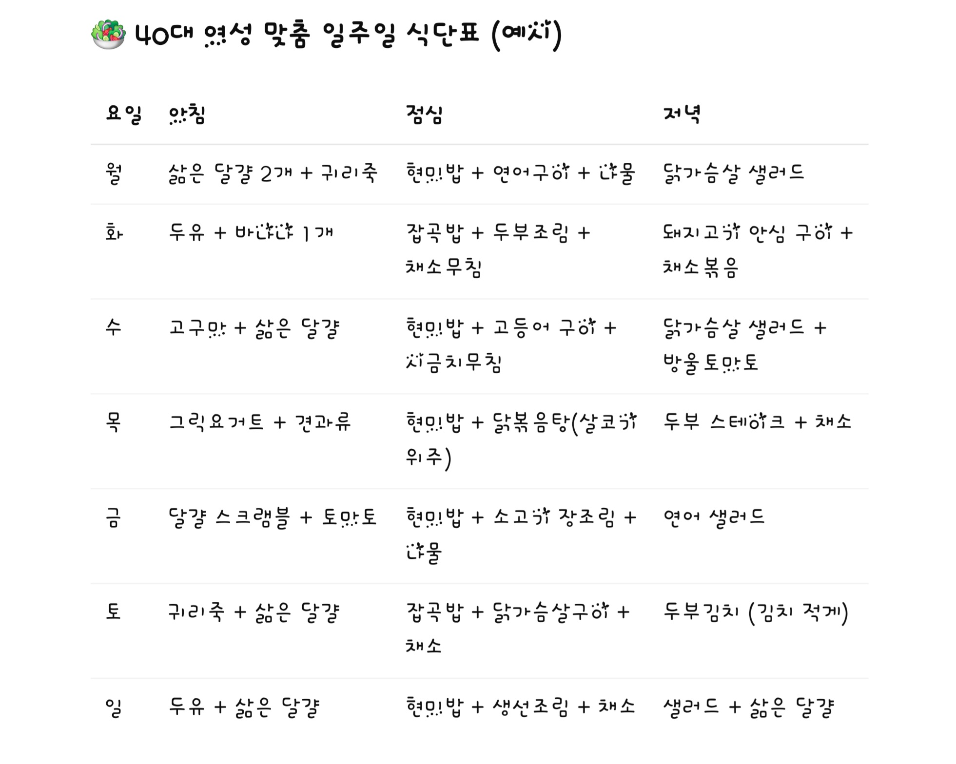🥗 40대 여성 맞춤 일주일 식단표 (예시)